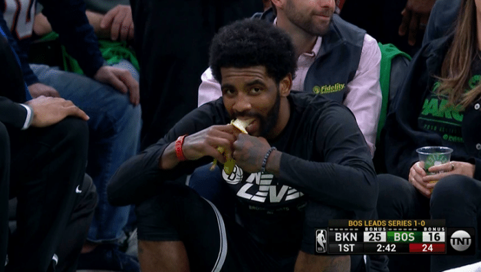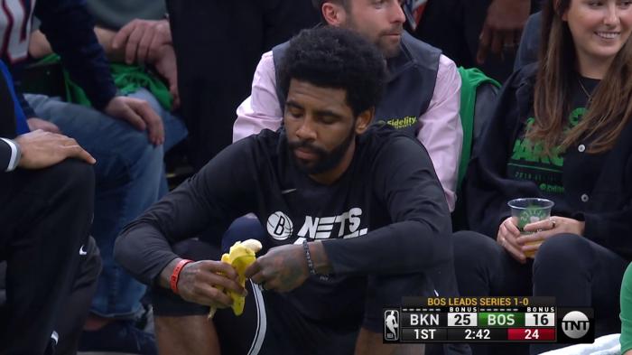 之后欧文坐回替补席,并在坐在场边吃香蕉补充能量。