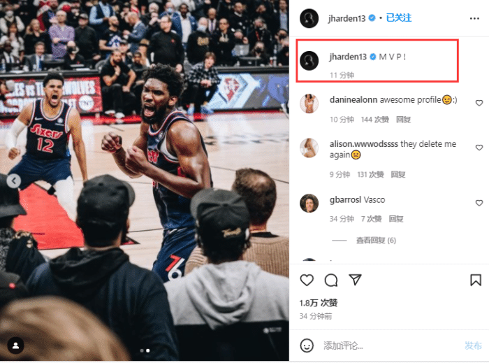 恩比德自曝手腕受伤!哈登晒大帝绝杀照庆祝胜利,配文盛赞:MVP