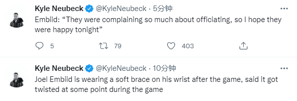 接受采访时,恩比德表示:我们都知道几年前在这座球馆里发生过什么事情;命中绝杀感觉很棒,但我们的任务还未完成,我们还得再赢一场。