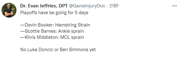 Evan Jeffries还发推写道:季后赛才打5天,布克腿筋拉伤、巴恩斯脚踝扭伤和米德尔顿MCL扭伤,东契奇和西蒙斯都因伤还没复出。