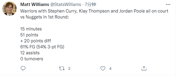 勇士和掘金两轮系列赛打完,勇士新死亡五小(库里+汤普森+格林+普尔+维金斯)同时在场11分钟狂赢掘金28分,正负值+29;高阶数据显示,勇士死亡五小百回合得分是204.3分,百回合失分仅为75.0分,每百回合净胜对手129.3分,相当于每个回合赢掘金1.293分。