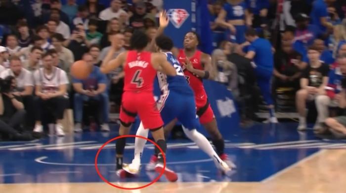 在猛龙和76人季后赛首轮G1比赛中,第四节9分06秒,巴恩斯在防守时不幸被恩比德踩到脚背,导致脚踝90度扭伤;随后巴恩斯捂着脚踝倒地不起,最终被两人搀扶离场,返回更衣室接受检查,因伤退出比赛,初步确诊为左脚踝扭伤。