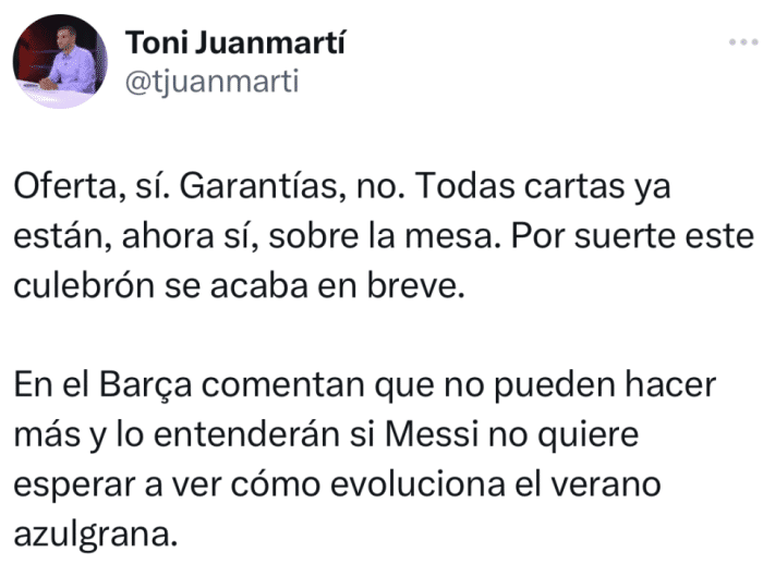来源:JRS直播网06-07 11:32JRS直播网06月07日在大巴黎官宣梅西自由身离队后,阿根廷球王未来去向,无疑是这几天全世界球迷最为关注的焦点之一。北京时间6月7日,来自加泰知名记者Toni Juanmartí的消息,尽管巴萨已经尽了一切努力,但他们现阶段无法保证能够注册梅西。