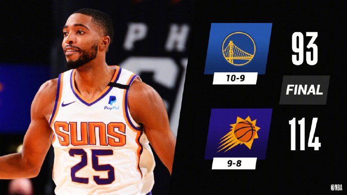 勇士(10-9):库里27分4篮板4助攻,维金斯16分5篮板,帕斯卡尔12分2助攻,怀斯曼5分6篮板,瓦纳梅克8分,贝兹莫尔7分5篮板2助攻,普尔7分1篮板,乌布雷4分4篮板,穆尔德3分3篮板,格林2分4篮板6助攻3断,卢尼2分4篮板2断。
