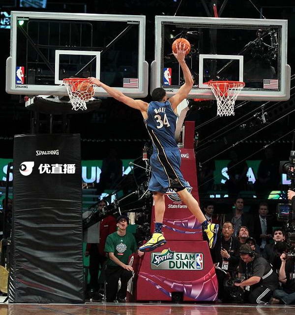 第二个出场的是雷霆的伊巴卡,他出场之后,后面跟随了一批扛着大旗的美女。伊巴卡从后面开始助跑,最后单手持球在罚球线起 跳单手扣篮成功,不过姿态不够优美,只拿到45分。
