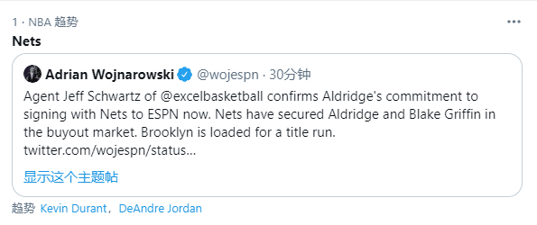 来源:JRS直播网03-28 12:04JRS直播网讯 马刺旧将阿尔德里奇已经做出最终决定,最终选择加盟篮网冲击总冠军,据ESPN名记沃纳罗斯基报道,阿德将和篮网签下一年老将底薪合同;阿德联手三巨头冲冠,篮网又成功捡漏,湖人和快船又白忙活了,这下篮网阵容实力再次提升,联盟大结局了吗?