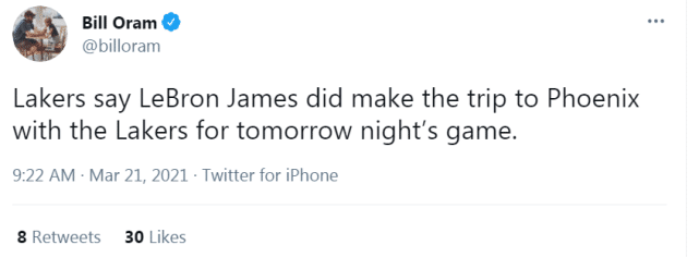 来源:JRS直播网03-21 15:30JRS直播网3月21日讯,据湖人官方的消息,詹姆斯将跟随湖人队飞往菲尼克斯,他们将背靠背对阵太阳。詹姆斯虽然不能出场,但就像他在社媒上说的那样,他不愿和队友分开。