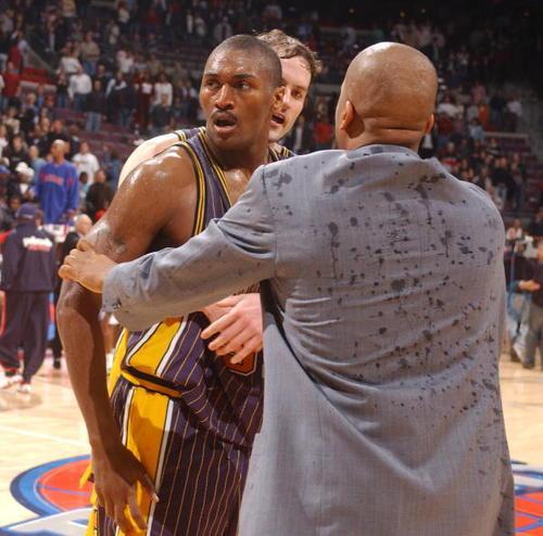 此时意外发生了,被激怒的活塞球迷扔下一杯啤酒,好家伙,不敢和大本较劲,还不敢和球迷吗?慈世平迅速起身冲上看台,揪着一个他认为是肇事者的球迷猛揍,而这个球迷就是约翰。看到约翰被打,他的朋友威廉姆上前帮忙,也被慈世平打了几拳。