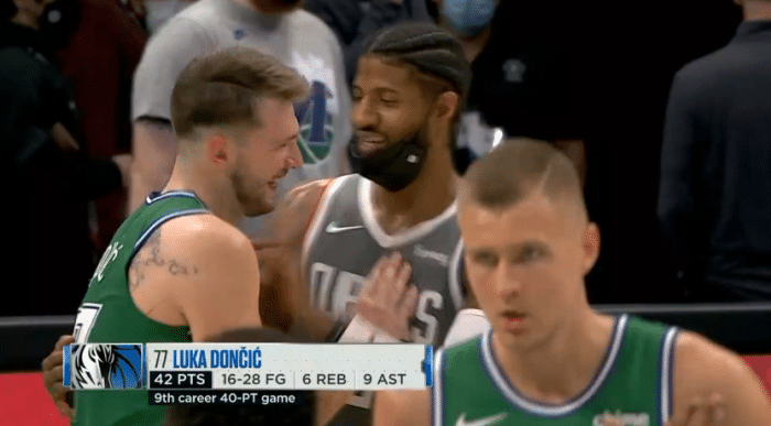 赛季初期,东契奇轻松打卡下班,带领独行侠51分屠杀快船,第二战则是东契奇轰下三双无奈输球,如今东契奇疯狂砍分,单挑小卡和乔治两大巨星,各种得分太不讲理,抛投直接杀死比赛;赛后小卡第一时间沮丧离场,东契奇和乔治拥抱,两人都咧嘴大笑。