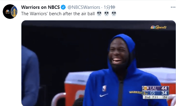 现场解说忍不住哈哈大笑,勇士替补席疯狂庆祝,库里坐在替补席哈哈大笑,还抱头做出不敢相信的手势,格林站起来咧嘴大笑,并且大喊That's air ball,勇士其他球员则是做出各种庆祝姿势;不知道情况的,还以为勇士打出不可思议的进球,可实际情况是库兹马罚球太偏,直接三不沾成大笑话。