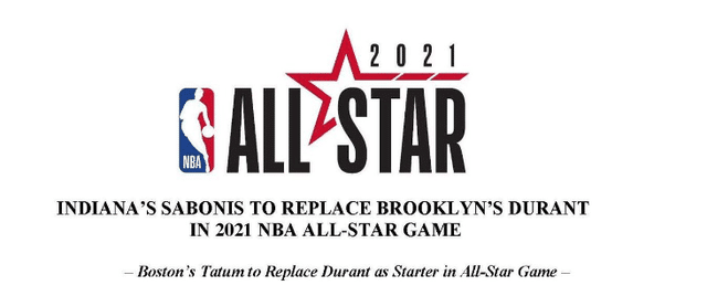 来源:JRS直播网02-27 10:20JRS直播网讯北京时间2月27日,篮网官方宣布,凯文-杜兰特因左腿筋伤势需要更多恢复时间,将缺席本赛季的全明星正赛。随后,NBA官方宣布,步行者球星小萨博尼斯将顶替受伤的杜兰特,入选东部全明星阵容,杜兰特的全明星首发位置,由绿军的塔图姆替代。