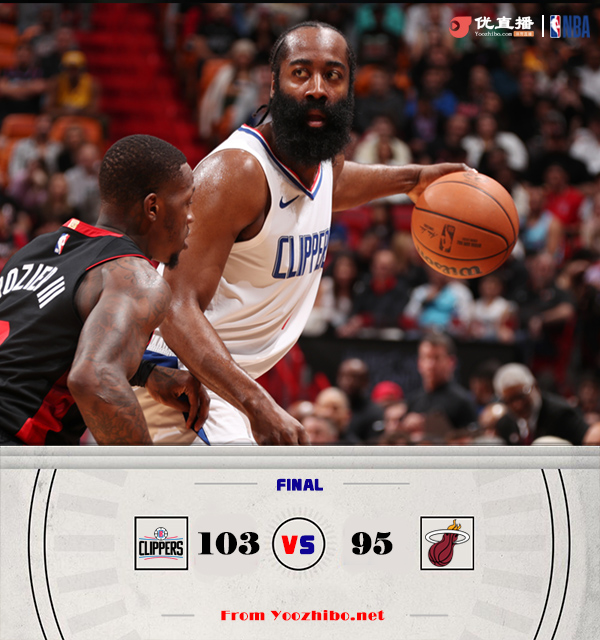 JRS直播网2月5日讯 NBA常规赛快船客战热火,快船最近发挥不错取得2连胜并且冲到西部第三,热火则是排在东部第八,最近也是2连胜,本场比赛希罗缺阵。开场后快船手感不佳只命中一记三分,热火打出13-3的开局取得领先,随后莱昂纳德和鲍威尔联手帮助快船缩小分差。第二节两队依旧致力于防守,快船外线手感稍有回暖,双方你来我往先后打出攻势,半场过后两队打成43平。易边再战,莱昂纳德带领快船占据微弱优势,第四节哈登连续助攻队友命中三分后自己也连中两记三分帮助快船将分差拉大到两位数,巴特勒最后时刻连连拿分但为时已晚,最终快船扑灭热火取得3连胜。