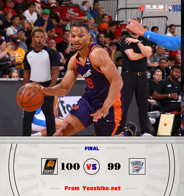 JRS直播网 7月18日讯 NBA夏季联赛,太阳对阵雷霆。开场后太阳利用三分先声夺人,随后雷霆一波11-0的攻势反超比分。第二节雷霆依旧占据场面优势保持领先。下半场回来场上局面依旧胶着,第四节太阳奋起直追用一波11-0的反扑将比分反超,雷霆用两记三分稳住阵脚,并且在第四节末段重新夺回领先,罗迪最后2.1秒造成三分犯规并且三罚全中,最终太阳100-99逆转雷霆。