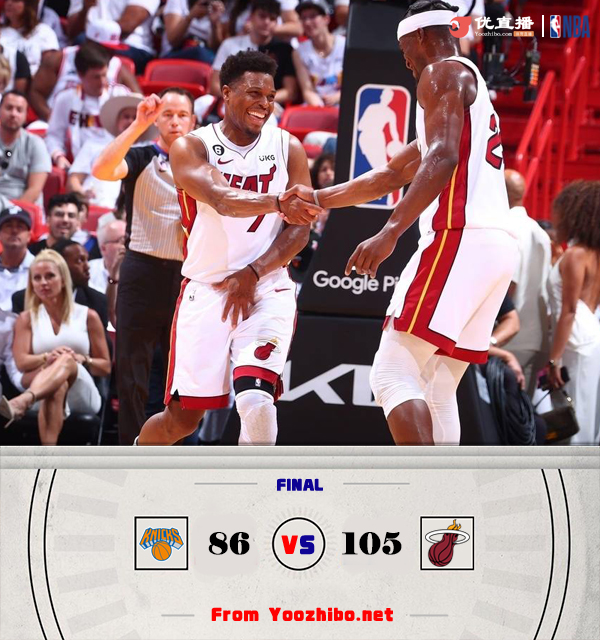 JRS直播网5月7日讯 NBA季后赛,热火回到主场迎来和尼克斯的G3。目前双方大比分1-1战平,巴特勒本场迎来复出。一开场,热火利用主场优势率先发力,轮番冲击篮筐得手很快取得两位数领先,布伦森挺身而出连投带罚拿分带队追赶,但热火持续发力,连中三分完成12-2的攻击波一度将分差拉开到19分,尼克斯及时回暖打出9-2止血,巴特勒连投带罚带队保持优势,半场战罢热火58-44领先。下半场,热火牢牢占据场上主动,不断扩大优势,泽勒和兰德尔及哈滕发生摩擦,热火持续发力将分差拉开到20分以上,尼克斯苦苦追赶无果。最终,热火105-86击败尼克斯,总比分2-1领先。