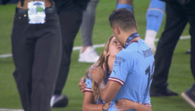 曼城夺冠,球场内成为庆祝、欢乐的海洋,球员们的爱人、妻子、孩子也都来到球场内,与夺冠的英雄们一起庆祝冠军。罗德里撒狗粮,作为曼城斩获欧冠冠军最大的功臣,打进曼城欧冠决赛队史首球的罗德里在赛后与爱人拥抱亲吻,现场撒狗粮。