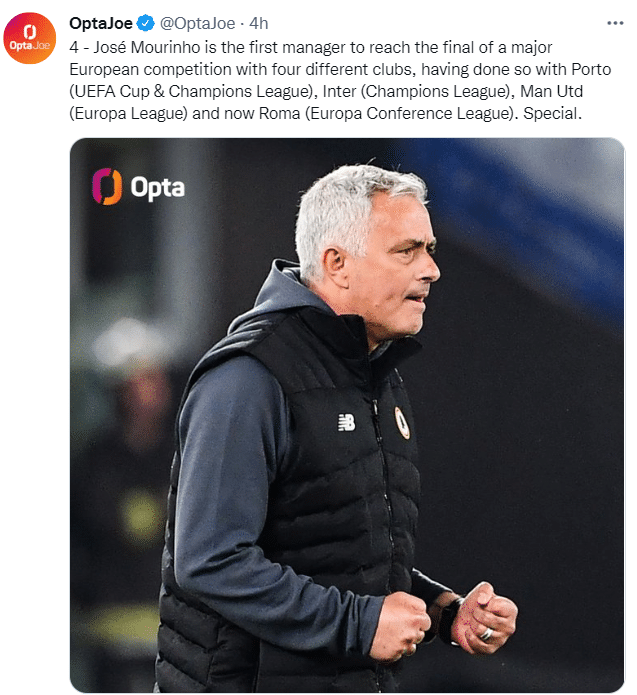 他曾带领波尔图进入欧联决赛和欧冠决赛,然后带领国米进入欧冠决赛,带领曼联进入欧联决赛,现在又带领罗马进入欧会杯决赛。