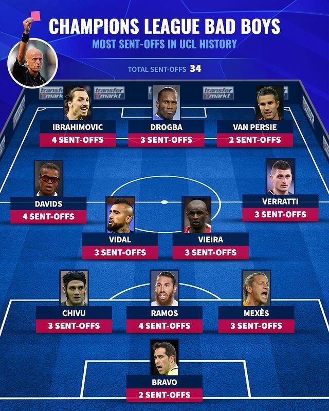 如图,这套阵容中,门将布拉沃在欧冠赛场上吃到过2张红牌,而后防线上的齐沃和梅克斯在欧冠赛场上拿到过3张红牌,拉莫斯在欧冠赛场上有4张红牌,而中场方面,比达尔、戴维斯、维埃拉和维拉蒂在欧冠赛场上都吃到过3张红牌。前锋线上,伊布在欧冠吃到过4张红牌,范佩西吃到过2张红牌,德罗巴拿到过3张红牌。这套阵容中的球员一共拿到了34张红牌,人均3张红牌。