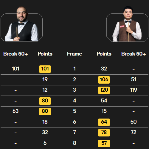 第三局:丁俊晖继续发力,打出单杆破百(119分),再胜一局,以2-1反超比分。