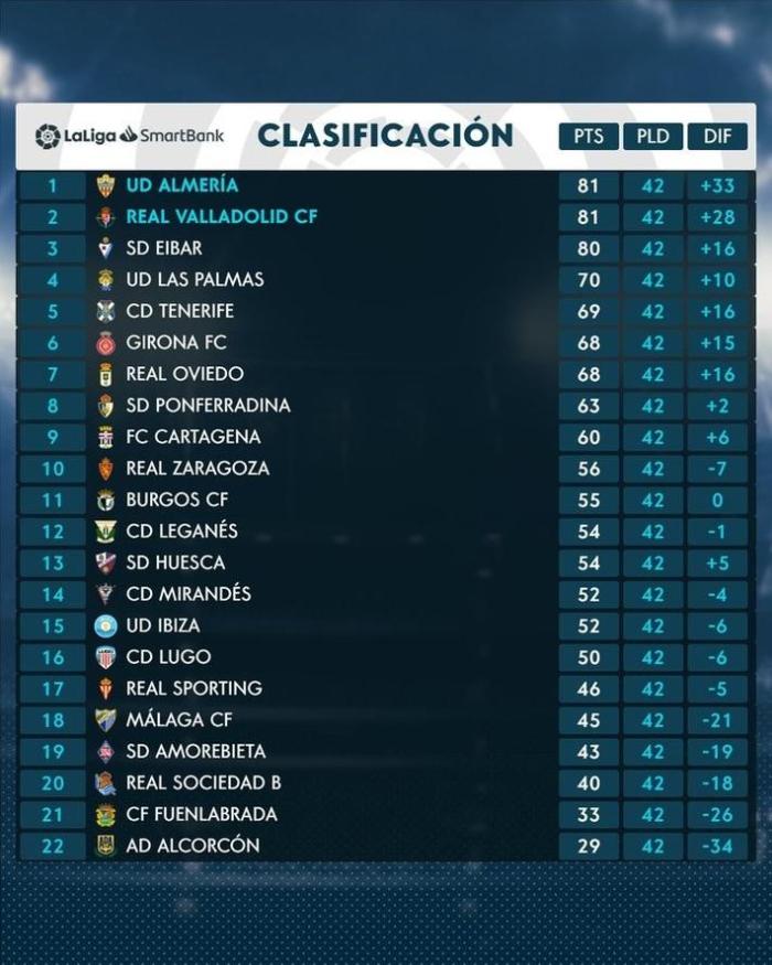 来源:JRS直播网05-30 20:35JRS直播网05月30日讯 西乙联赛今天落下帷幕,阿尔梅里亚和巴拉多利德直接获得升级资格,而有4支球队则需要参加升级附加赛。