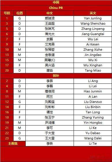 国足替补:2-李昂、4-李磊、8-蒿俊闵、11-阿兰、12-刘殿座、14-刘彬彬、16-谭龙、18-张玉宁、19-尹鸿博、21-李可、22-于大宝、23-王大雷