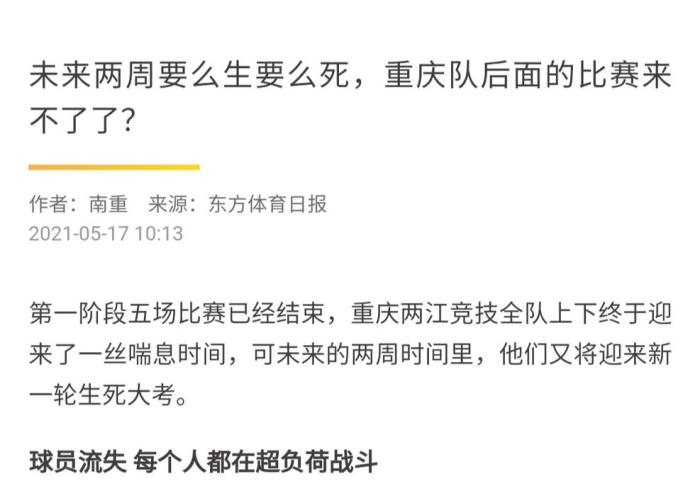 JRS直播网讯 据《东方体育日报》消息,休赛期重庆两江竞技的命运会见分晓,未来两周的内要么生要么死,俱乐部的存亡问题已经没有灰色地带了,一线队已经做好了最坏的打算。