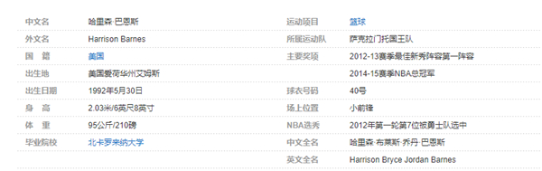 哈里森-巴恩斯(Harrison Barnes),1992年5月30日出生于美国爱荷华州艾姆斯(Ames, Iowa),美国职业篮球运动员,司职小前锋,效力于NBA萨克拉门托国王队。于2012年通过选秀进入NBA,先后效力于勇士队、独行侠(小牛)队和国王队,新秀赛季入选最佳新秀阵容第一阵容,2014-15赛季随勇士队夺得NBA总冠军。