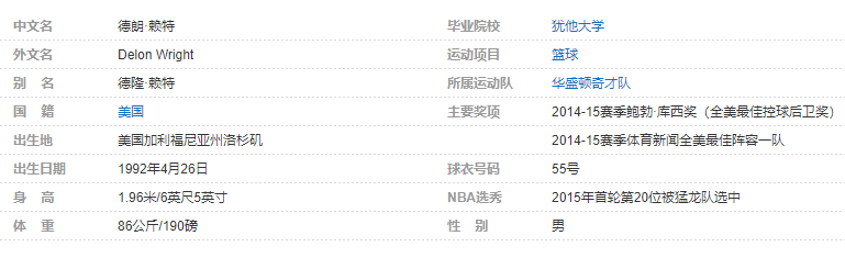 德朗-赖特(Delon Wright),1992年4月26日出生于美国加利福尼亚州洛杉矶(Los Angeles, CA),美国职业篮球运动员,司职后卫,效力于NBA华盛顿奇才队。
