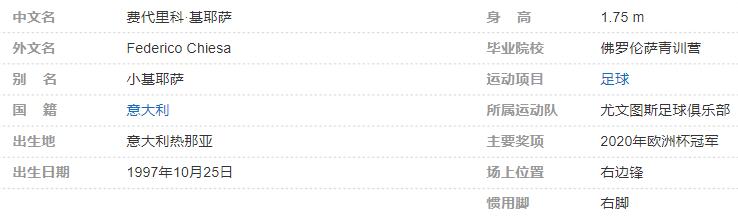 基耶萨(Federico Chiesa),出生于1997年10月25日,是一名意大利籍足球运动员,司职右边锋及中场,目前他效力于意甲的尤文图斯俱乐部,同时也是意大利国家队的一员。