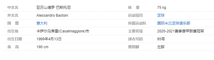 亚历山德罗·巴斯托尼(Alessandro Bastoni),1999年4月13日出生于意大利卡萨尔马焦雷(Casalmaggiore)市,意大利足球运动员,司职后卫,现效力于国际米兰足球俱乐部。 [1] 2020-21赛季,巴斯托尼帮助国际米兰夺得意甲冠军。个人简介