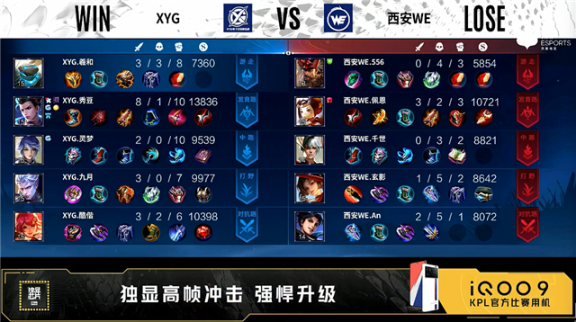 双方常规开局。2分22秒XYG发育路击杀鲁班七号。4分29秒发育路团战XYG打出0换2。4分40秒XYG摧毁敌方发育路外塔。5分27秒XYG对抗路击杀曜。5分44秒XYG摧毁敌方对抗路外塔。6分54秒中路团战XYG打出0换2。7分57秒XYG发育路击杀云缨。8分29秒发育路团战西安WE打出1换3。10分17秒XYG击杀云缨并摧毁敌方中路外塔。11分27秒XYG中路击杀曜。11分52秒XYG拿下暗影主宰。12分12秒XYG摧毁敌方对抗路二塔。12分45秒双方中路1换1,XYG摧毁敌方中路二塔。13分02秒XYG野区击杀云缨。13分34秒XYG主宰处击杀曜。14分08秒XYG击杀云缨并摧毁敌方对抗路高地塔。14分38秒XYG拿下暗影暴君。15分11秒XYG中路打出0换2。15分19秒XYG团灭对手摧毁水晶拿下比赛。