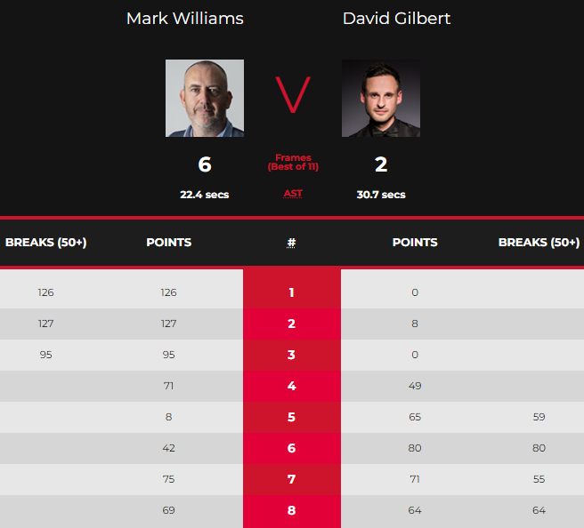 第七局,马克-威廉姆斯以77:71逆转单杆55分的吉尔伯特,并以5-2领先后者拿到赛点。