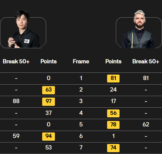 决胜局:莱恩斯在关键时刻表现出色,完成单杆88分的绝杀,最终以4-3的比分战胜张家玮,晋级下一轮。